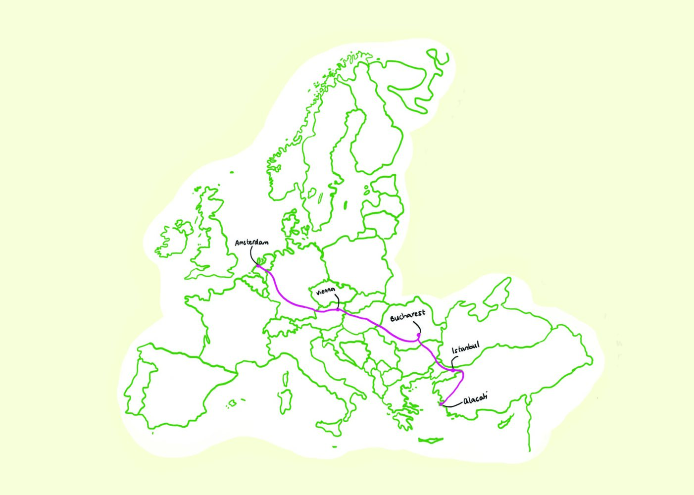 I use the train journey to reflect on the personal dilemmas regarding the climate. What do I give up on a personal level to contribute to the collective interest of fighting climate change? I document my journey and my reflections on this topic. On my train journey I stop in Vienna, Bucharest and Istanbul before arriving at my final destination in Izmir. Or Alaçati to be precise. The idea of this project is to ask other people to reflect with me on this dilemma between the personal and the collective. I take writable cards with me that I can hand out to the people I meet on my journey and I setup a website for the project as well: Amsterdamtoturkey. I will ask them the following questions: