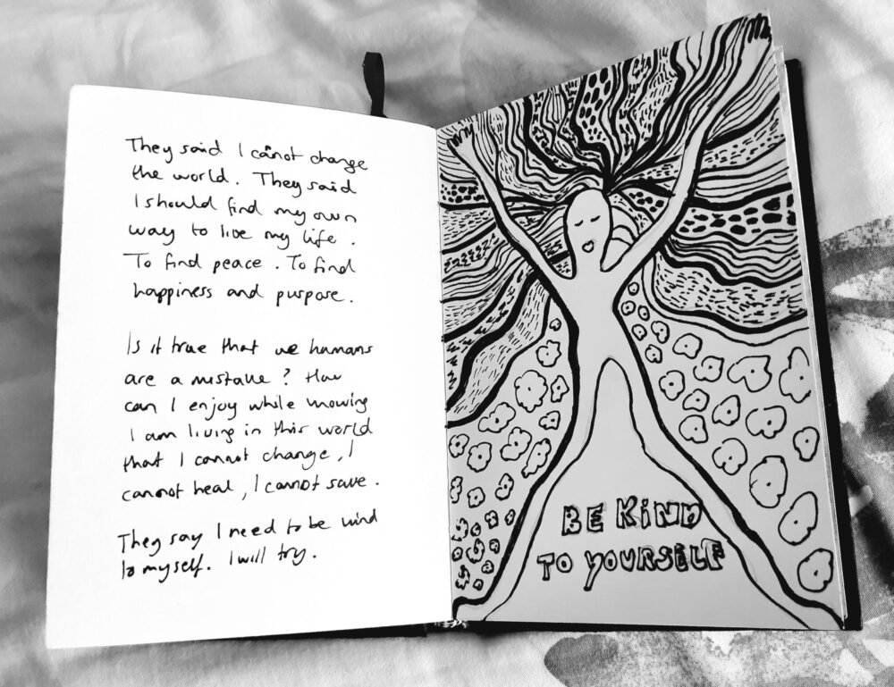 I learned recently from my psychologist there are more people like me. They are called the highly sensitive people. I felt relieved because I now understood why I’ve always struggled so much with all those thoughts in my mind and why I care so much about people and what they do. I discovered it – you might say – by accident because something happened to me last year. I got a serious climate depression after seeing a work of art and listening to the news about the forest fires. I realized more than ever how we treat each other and our planet and it made my head spin.